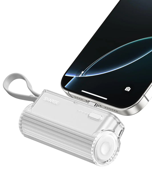 Sharge Flow Mini 5000mAh Power Bank – USB-C with Built-In Cable for iPhone 13–16, iPad, Galaxy S23 & S24 Ultra