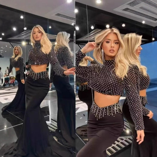 Women’s Beaded Two-Piece Skirt Set – Sexy Half-High Collar Long Sleeve Crop Top with Fitted Mini Skirt